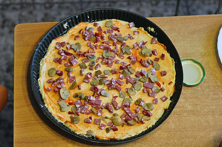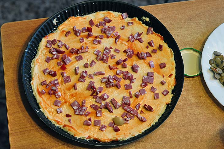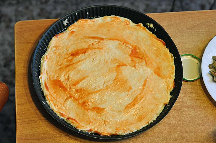 Хитрость заключается в следующем: смазываем сверху тесто кетчупом и начинаем кетчуп столовой ложкой равномерно распределять, разравнивая при этом и само тесто. Ложка не прилипает и вовсе не нужно ее смазывать маслом. Далее перед вами стоит выбор: либо продолжить и выкладывать начинку, либо, если вы любите более сухое и хрустящее тесто, отправить получившуюся основу в духовку и оставить там минут на 5-10 при температуре 190-200 °С. Время выпекания зависит от толщины получившегося пласта (если он пару мм, то можно смело сразу выкладывать начинку, если 5-10 мм, то желательно предварительно его слегка поджарить, т.к. в итоге может получится слегка сырым и клеклым).