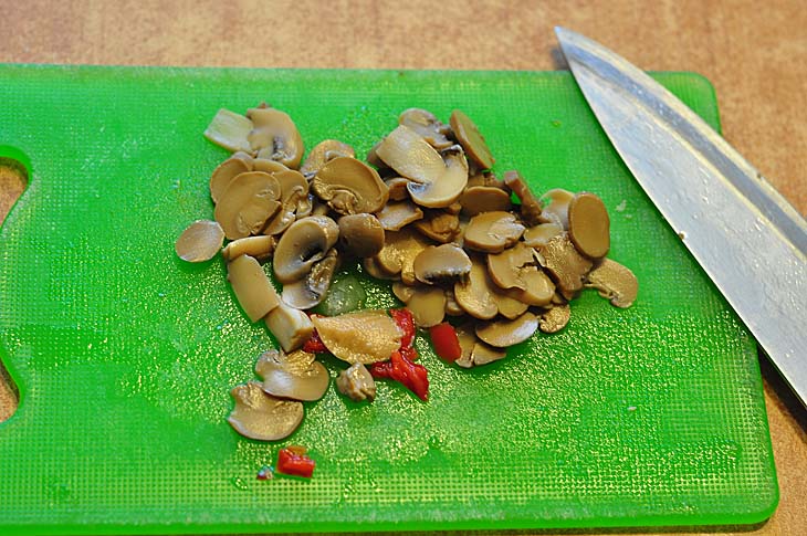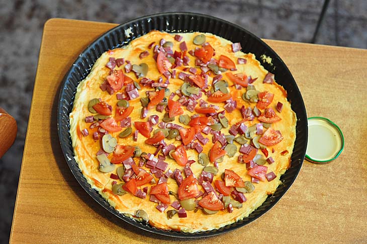 И помидоры. Можно добавлять соленые огурцы (даже нужно, но под рукой не оказалось), маслины, различную зелень. В моем случае начинка была более скромной: