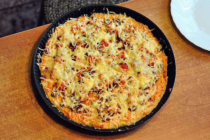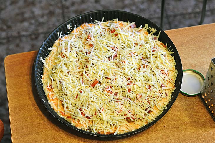 Сверху обильно посыпаем тертым сыром и в духовку. Если до этого тесто в духовке еще не побывало, то необходимо отправить пиццу туда на 15-20 минут, если же побывало, то хватит и 10-15 минут. Тут в первую очередь необходимо смотреть по сыру - как весь расплавился и стал золотым, так уже пора вытаскивать. Температура все та же - 190-200 °С.