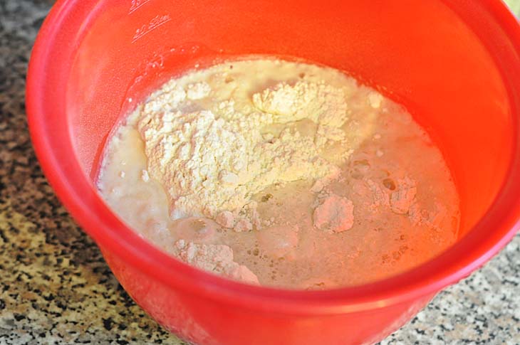 В составе нет ничего лишнего, так что опасаться не стоит, а тесто получается отменное. Высыпаем, заливаем воду согласно инструкции и перемешиваем: