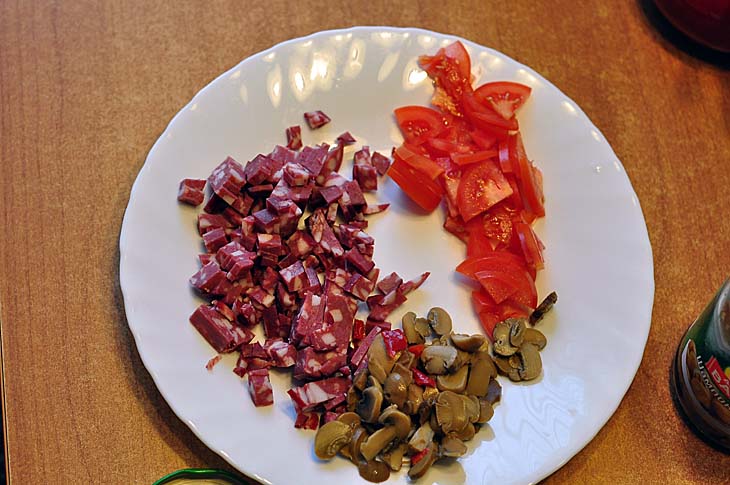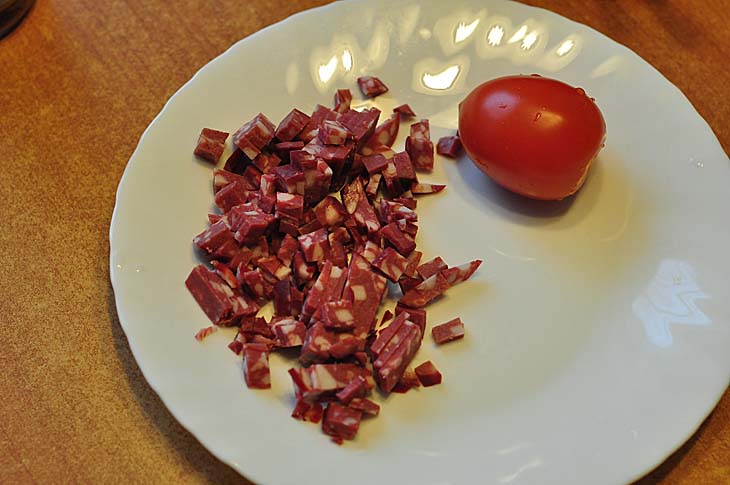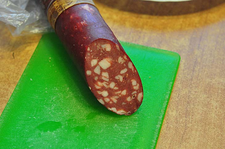Берем отдельную тарелку и нарезаем на нее начинку, сначала колбасу: