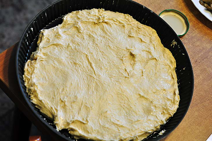 Вот и тесто подошло, равномерно его распределяем, но при этом не стараемся как-либо разровнять, тут есть одна хитрость: