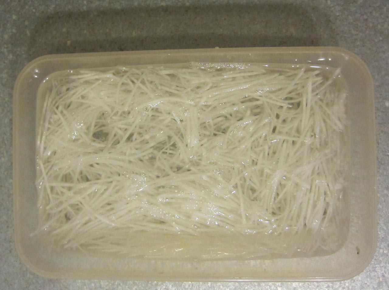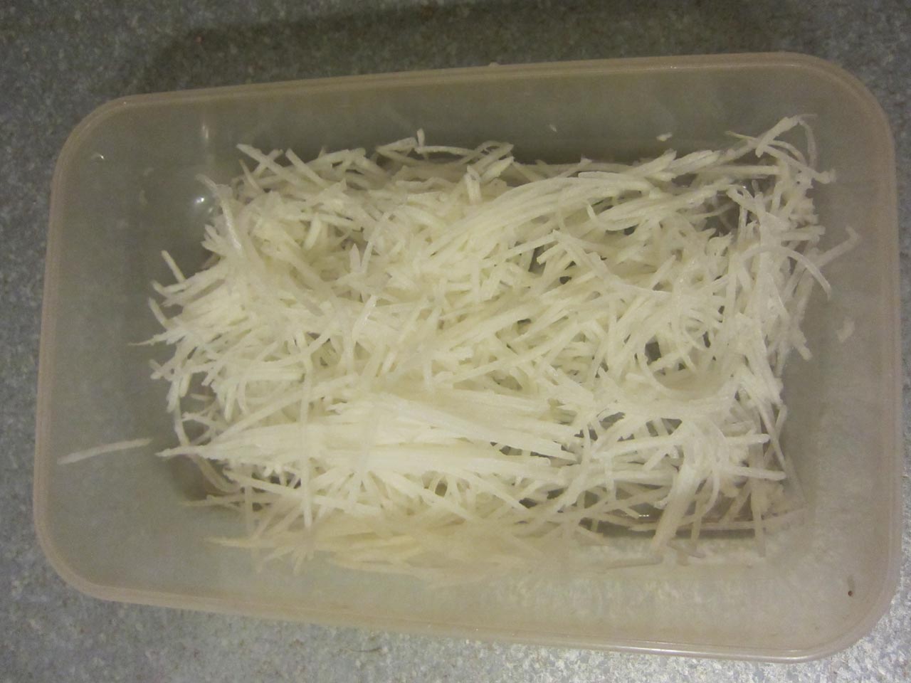 2. Очистить редьку , натереть соломкой и замочить в холодной воде на 15 минут (для удаления горечи). Затем слить воду и отжать редьку.