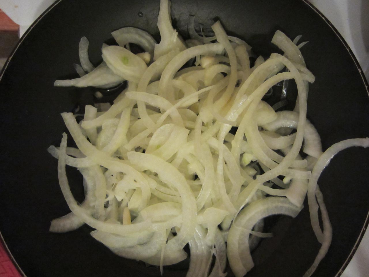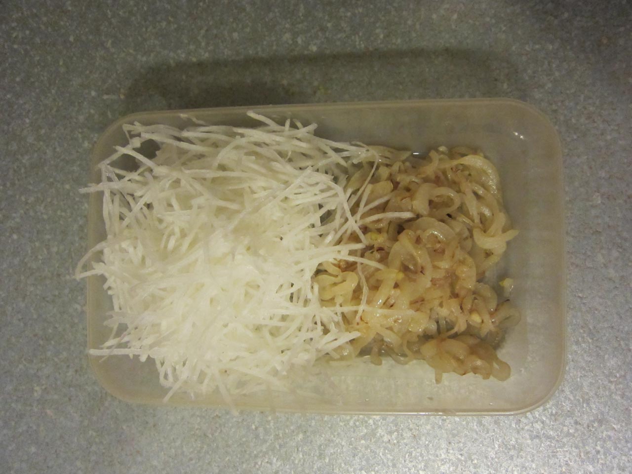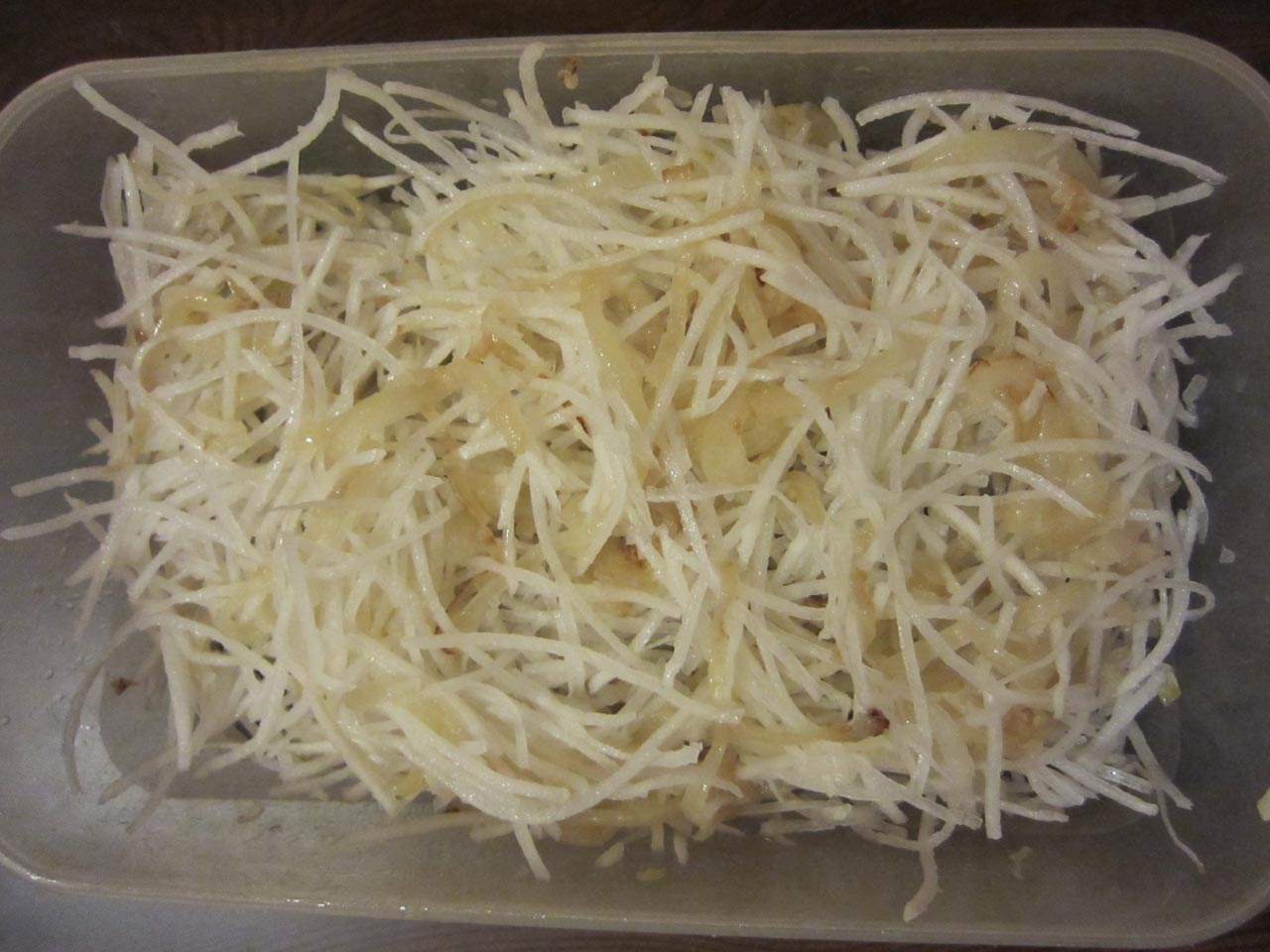 3. Лук нарезать полукольцами и обжарить до золотистого цвета в растительном масле. Приготовленный лук смешать с редькой.
