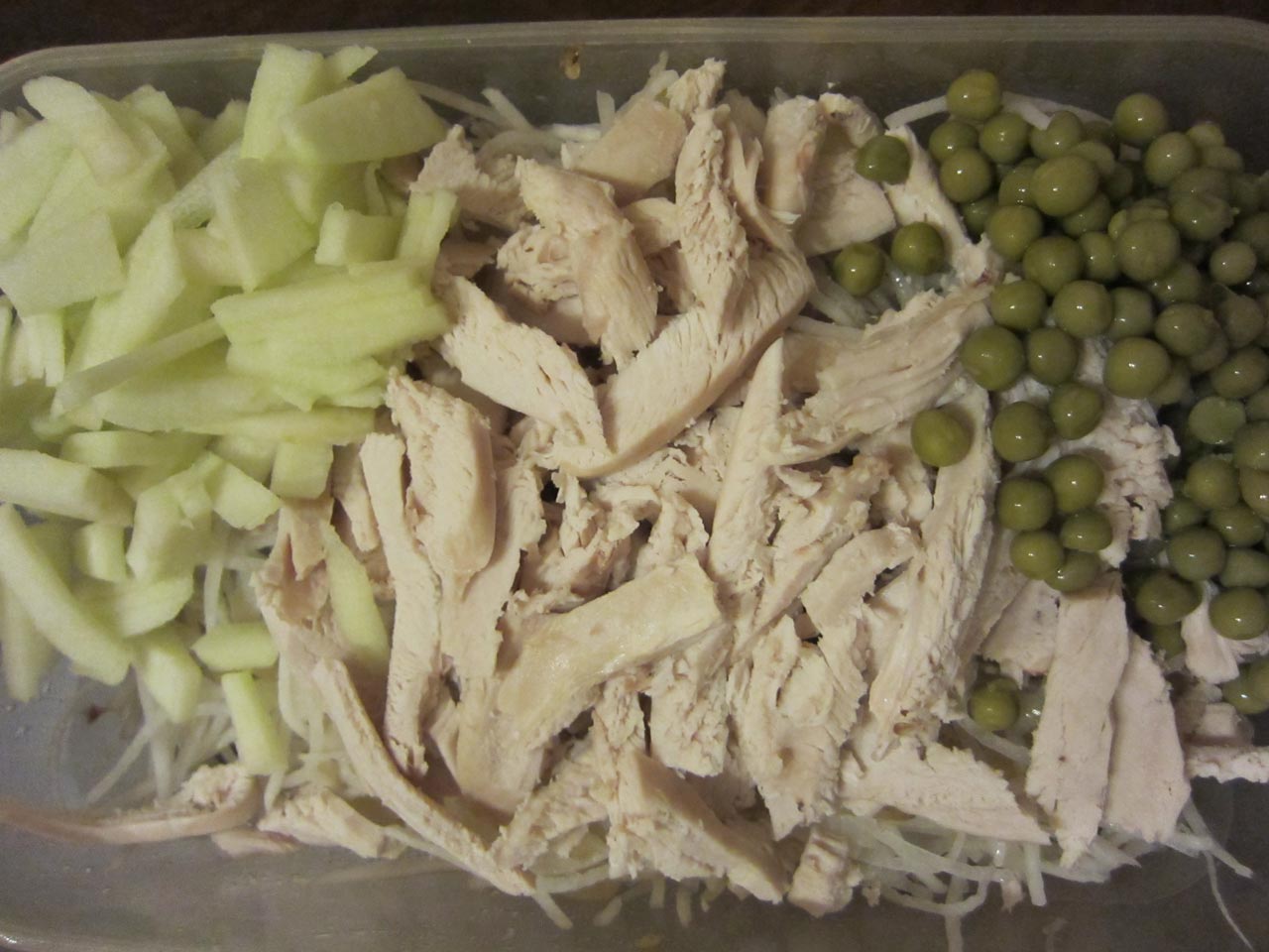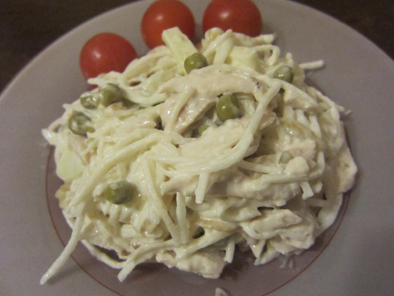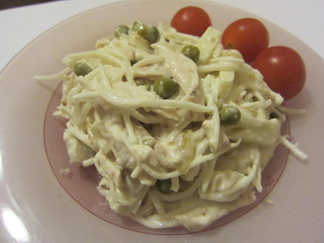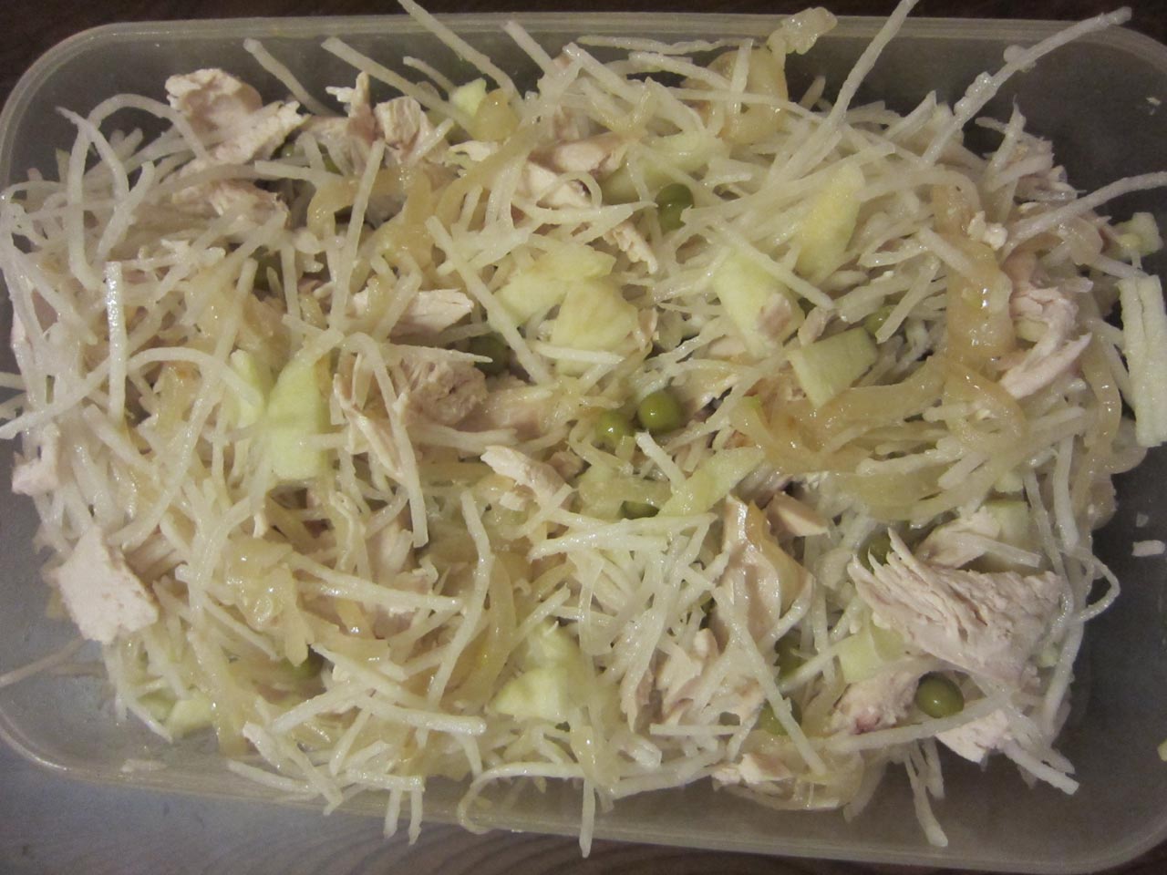 4. Яблоко нарезать тонкой соломкой. Курицу, яблоко и горошек "отправить" к редьке с луком. Теперь можно по вкусу добавить специй (соль и перец), заправить майонезом и тщательно перемешать.