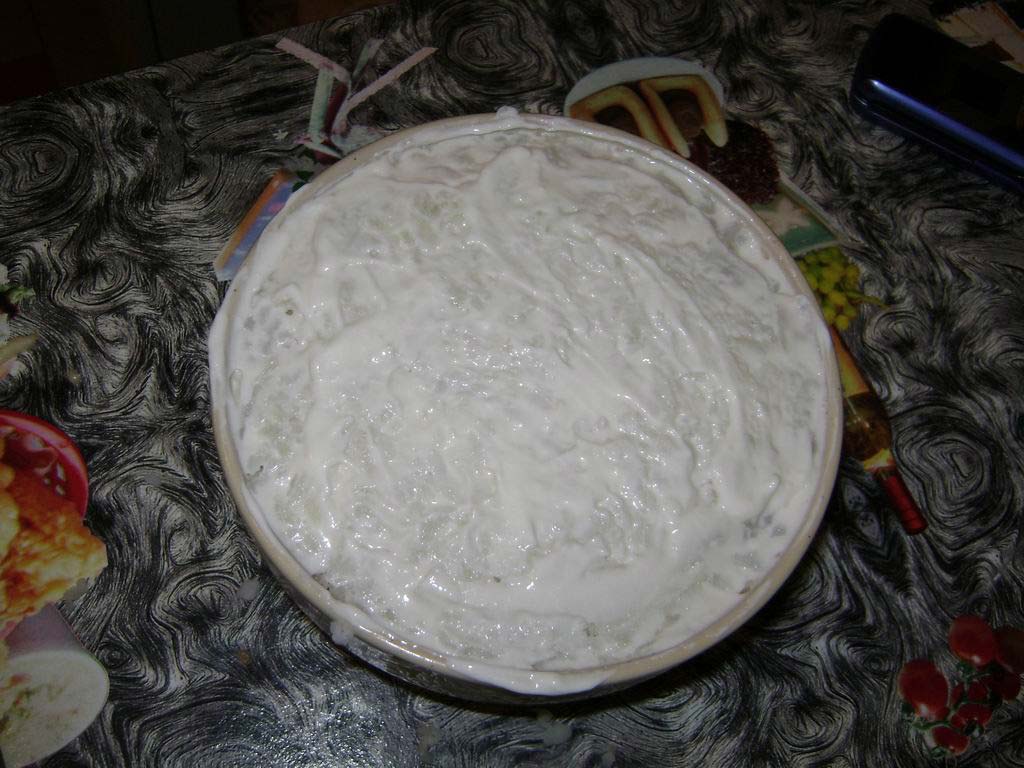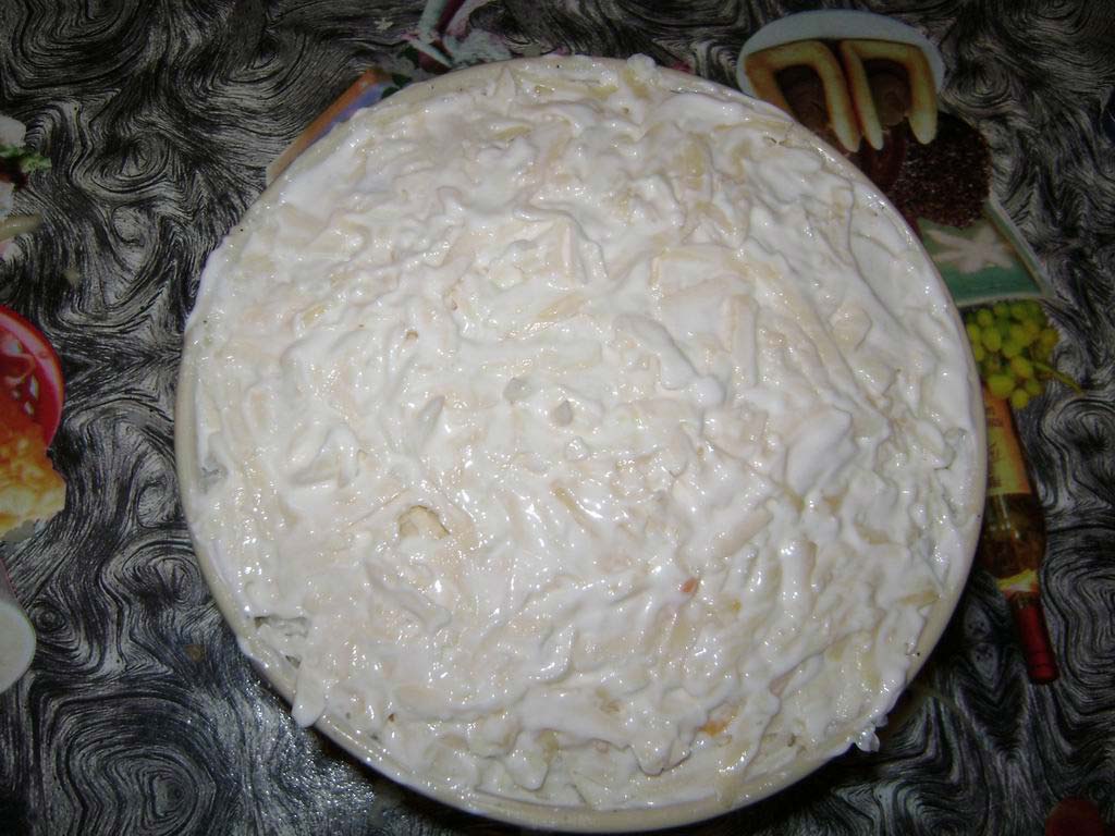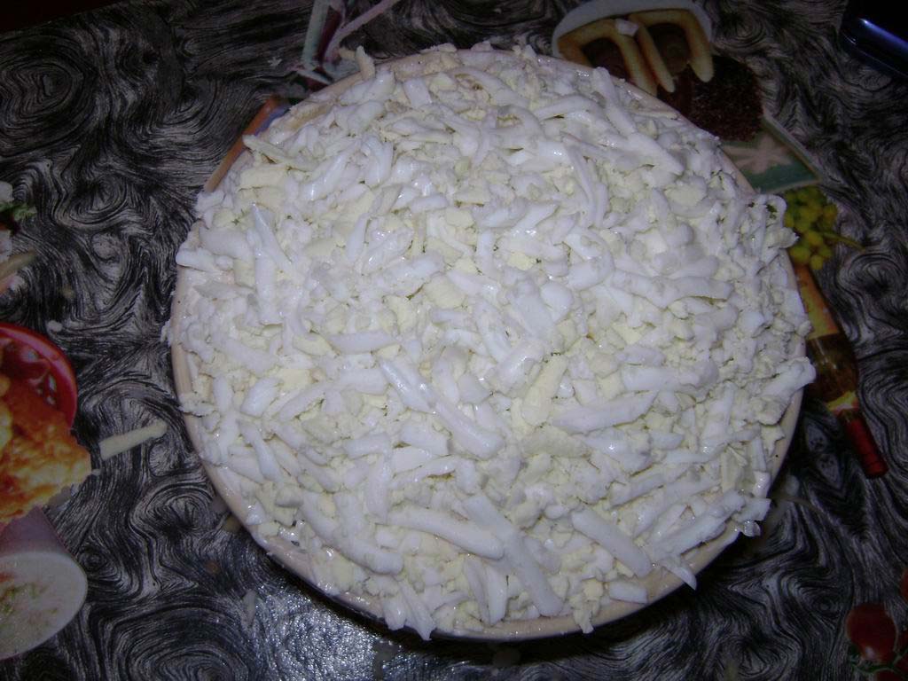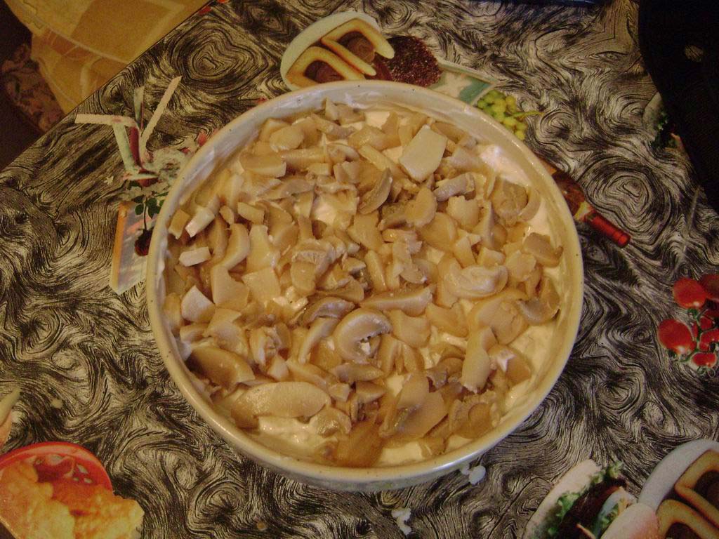 Картошку, морковь, яйца, курицу сварить. Курицу, грибы (в нашем случае шампиньоны) нарезать. Яйца, картошку, морковь, сыр натереть на крупной тёрке. Все приготовленные ингредиенты укладываются слоями, смазанными майонезом.
