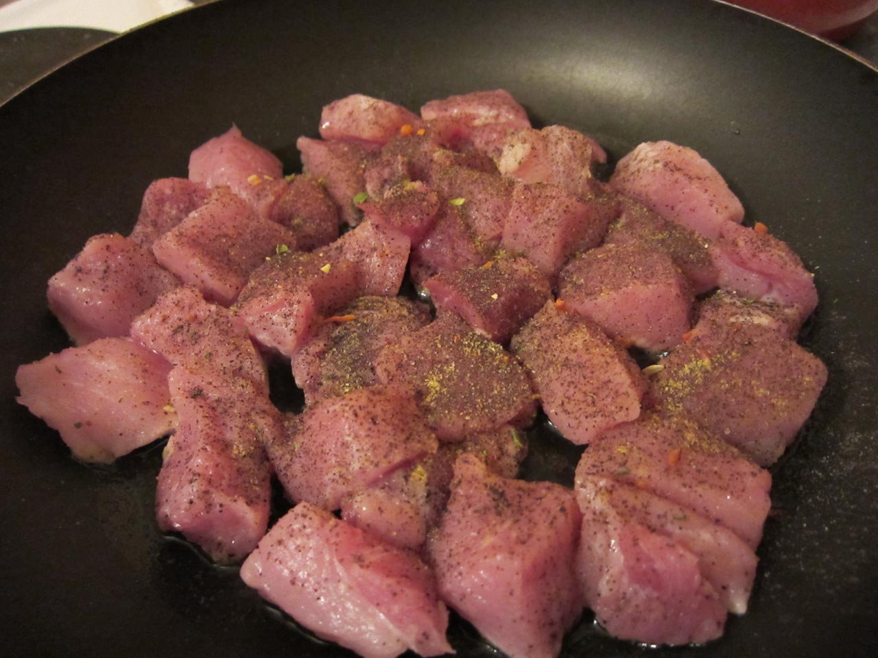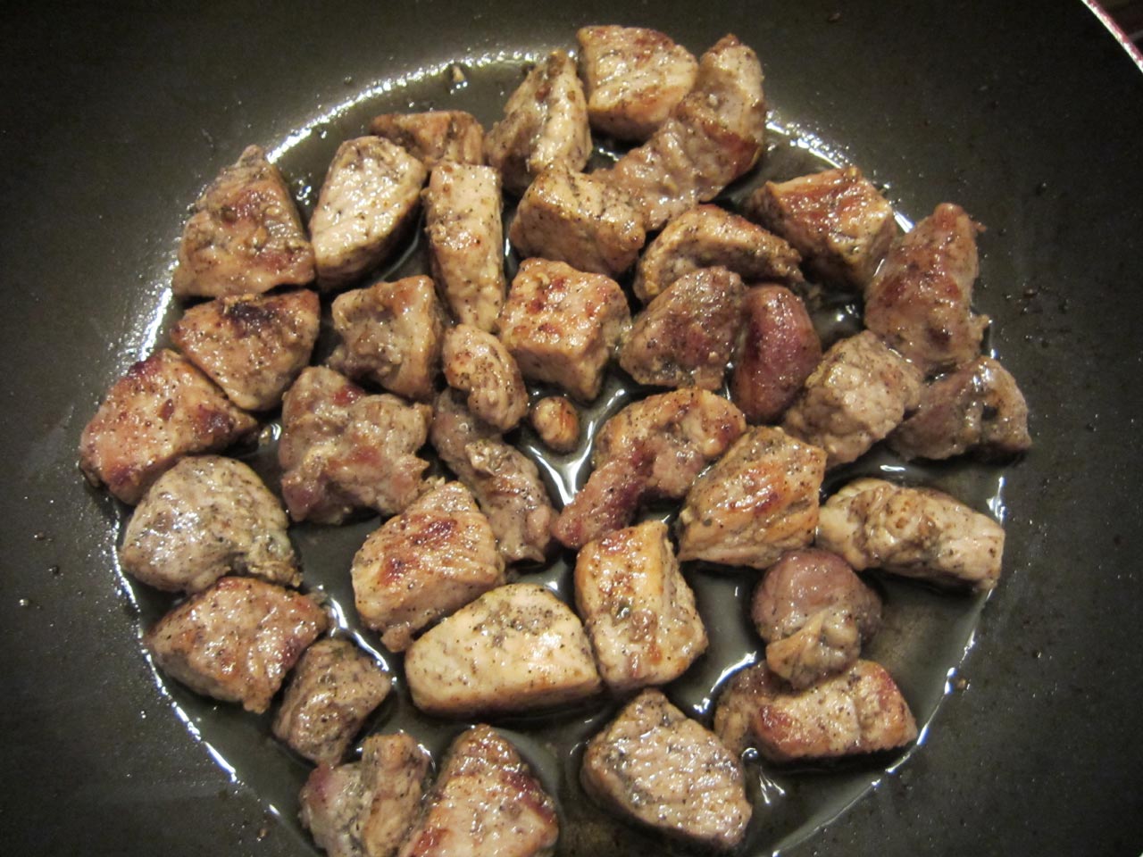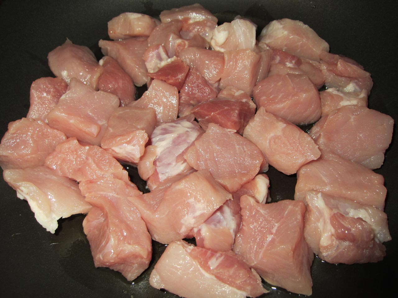 1. Берём мясо и тщательно промываем. Затем, подсушиваем его бумажным полотенцем, режем на куски средних размеров и отправляем эти мясные кусочки на сковородку.