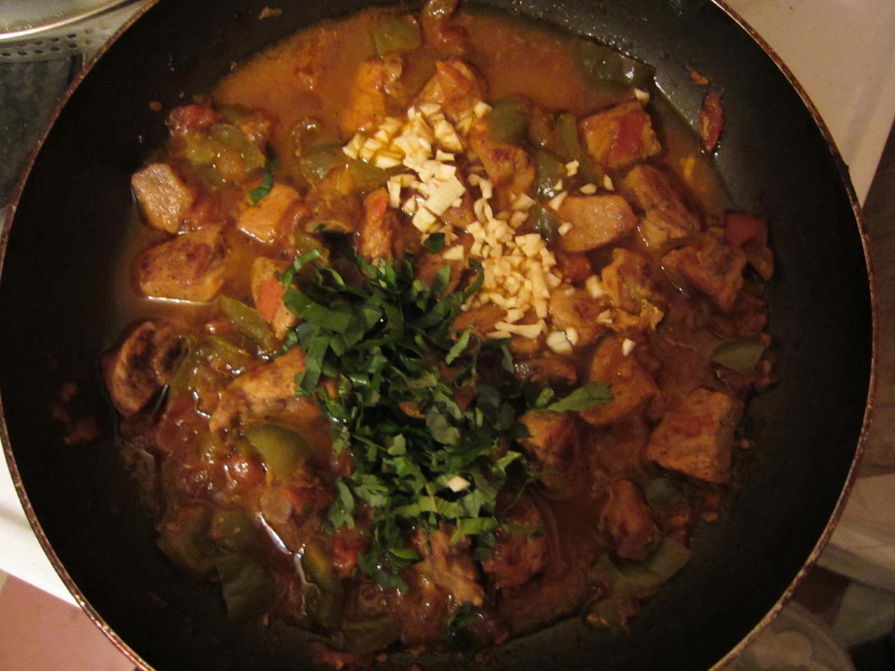 5. За 5 минут до завершения готовки, к мясу нужно будет добавить порезанные чеснок и базилик.