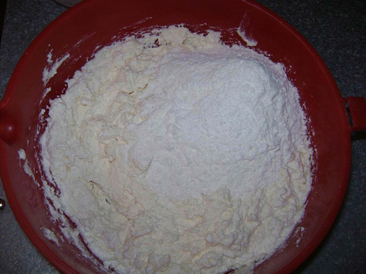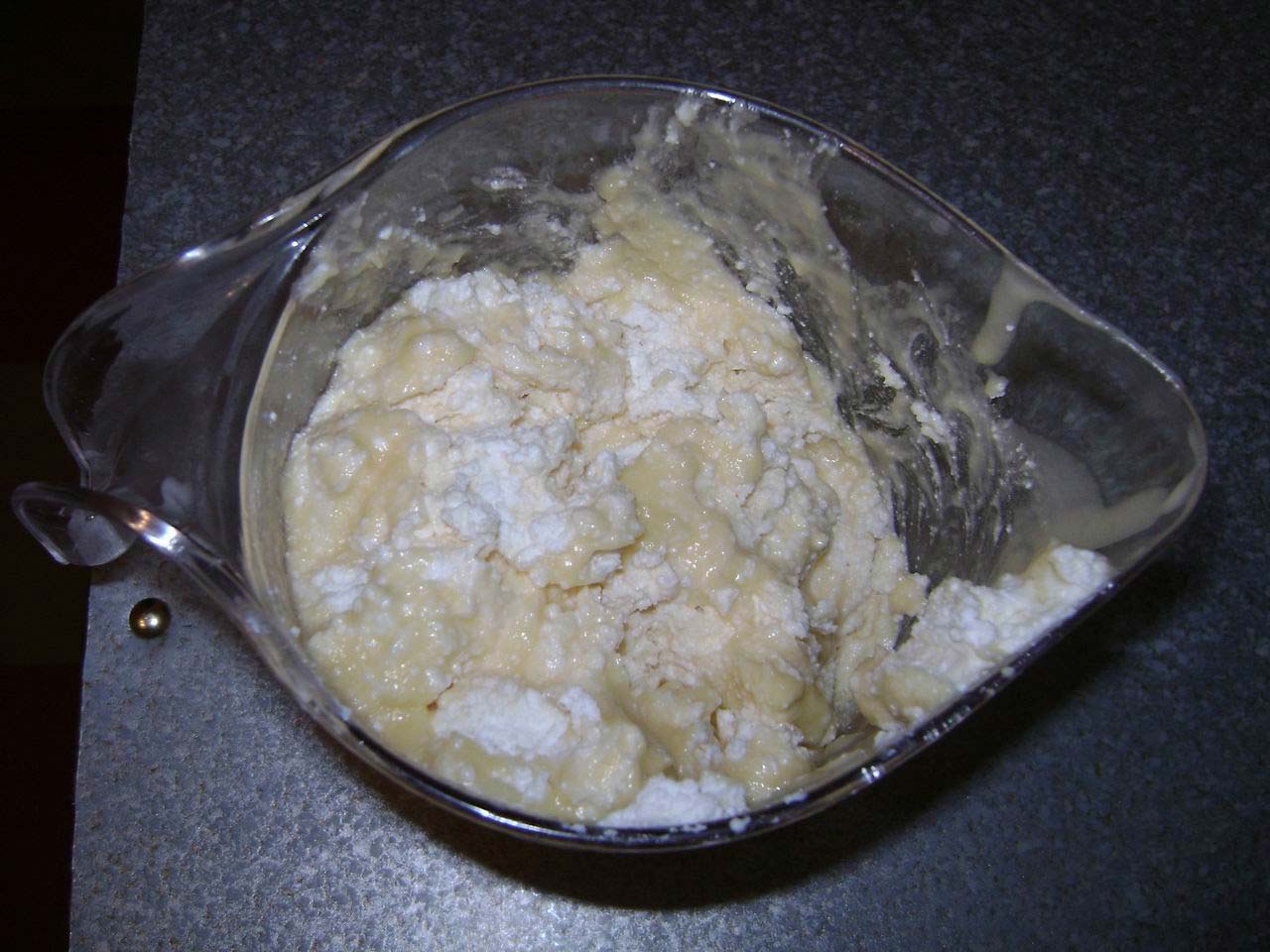 4.Небольшими порциями добавляем муку и тщательно перемешиваем. И так далее, пока масса не станет более густой. Затем, замешиваем тесто так, чтобы отлипало от рук.