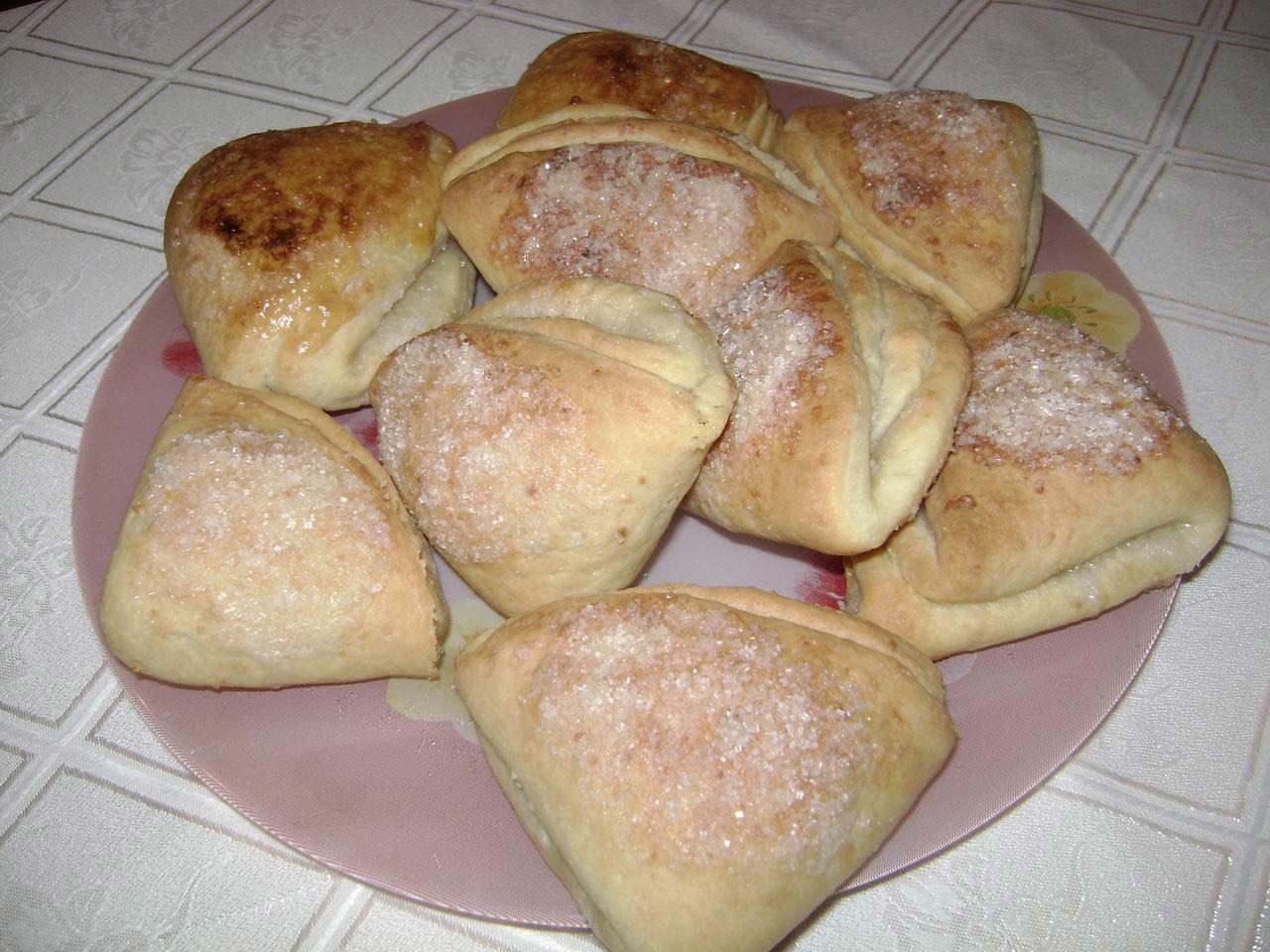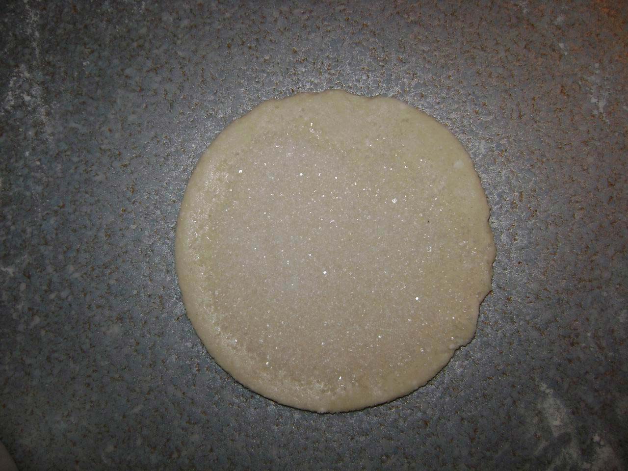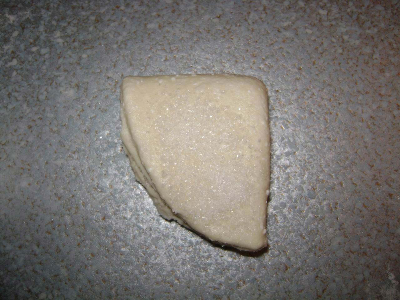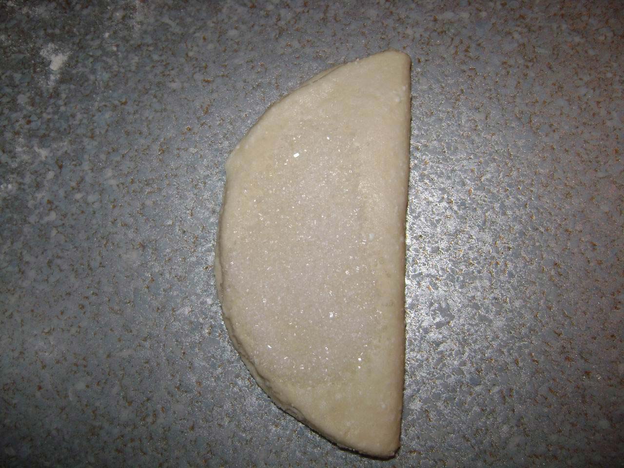 6.Эти лепёшки обильно посыпаем сахаром, сворачиваем пополам и опять посыпаем сахаром. И ещё раз сворачиваем, чтобы получился треугольник и снова посыпаем сахаром.