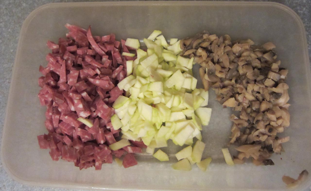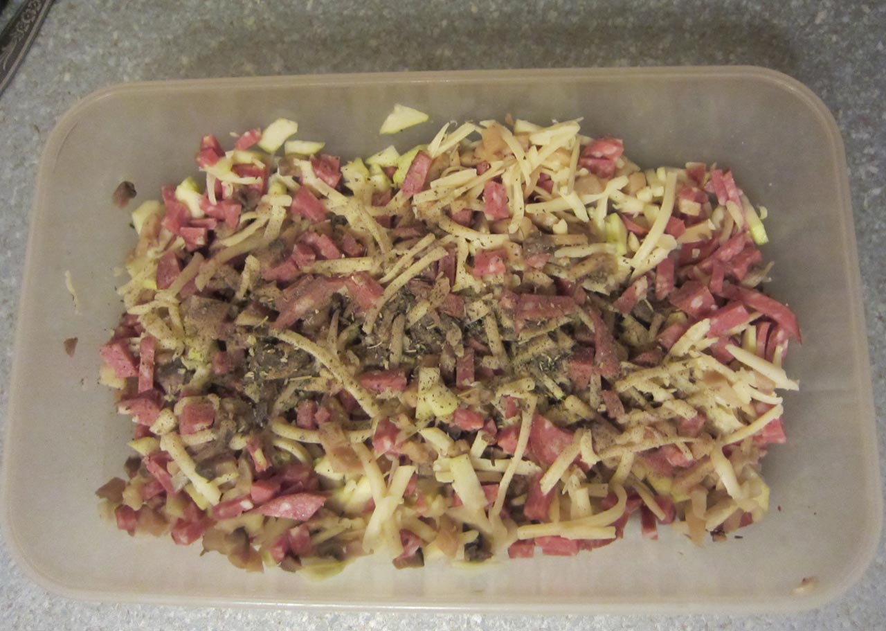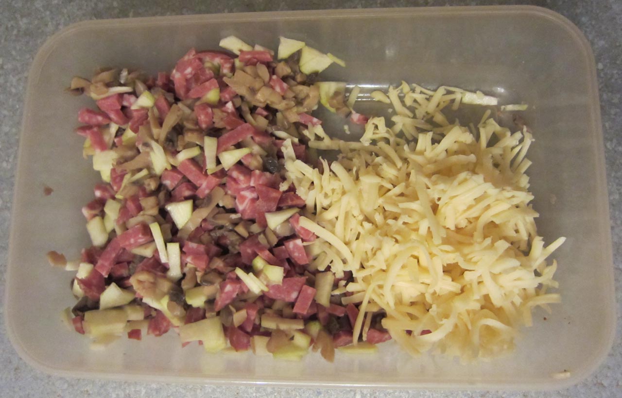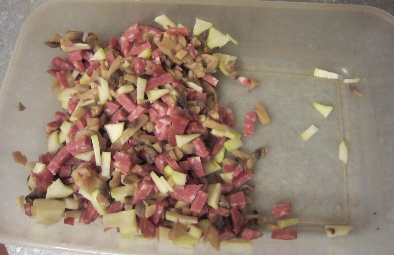 1. Нарезаем колбасу, цуккини и шампиньоны тонкой соломкой или кому как нравится. Перемешиваем:
