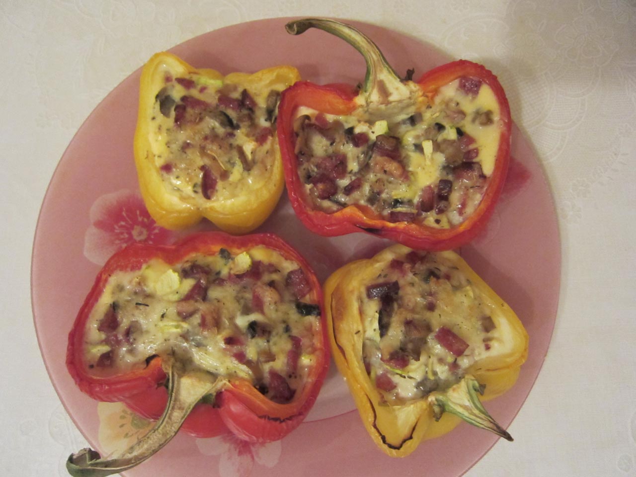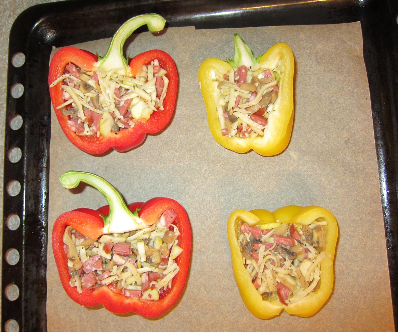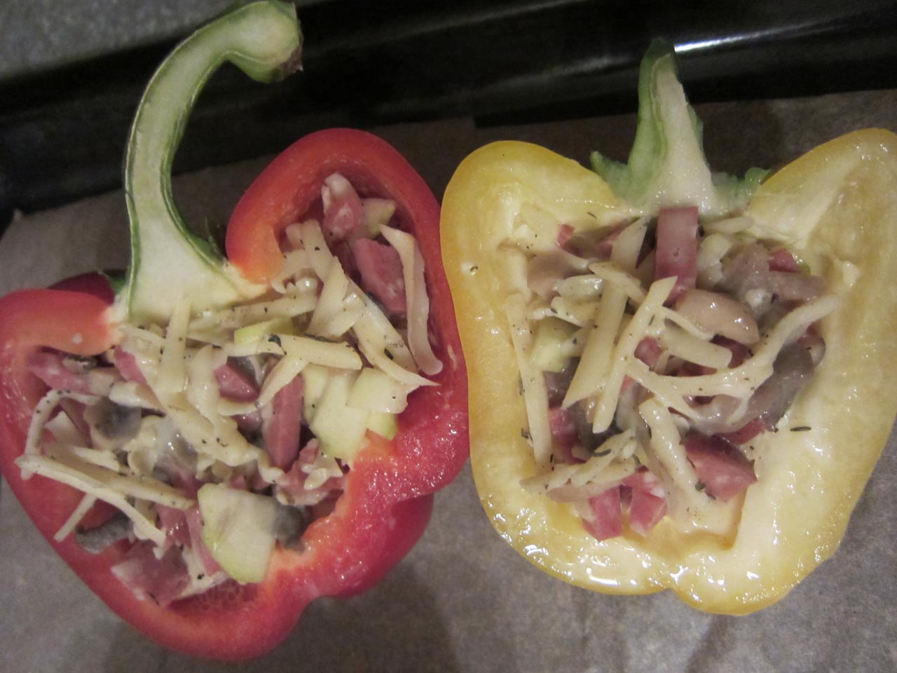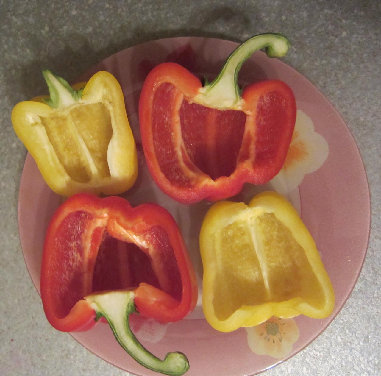 4. Перцы разрезаем на две части, удаляем семечки и начиняем их полученным "фаршем".
