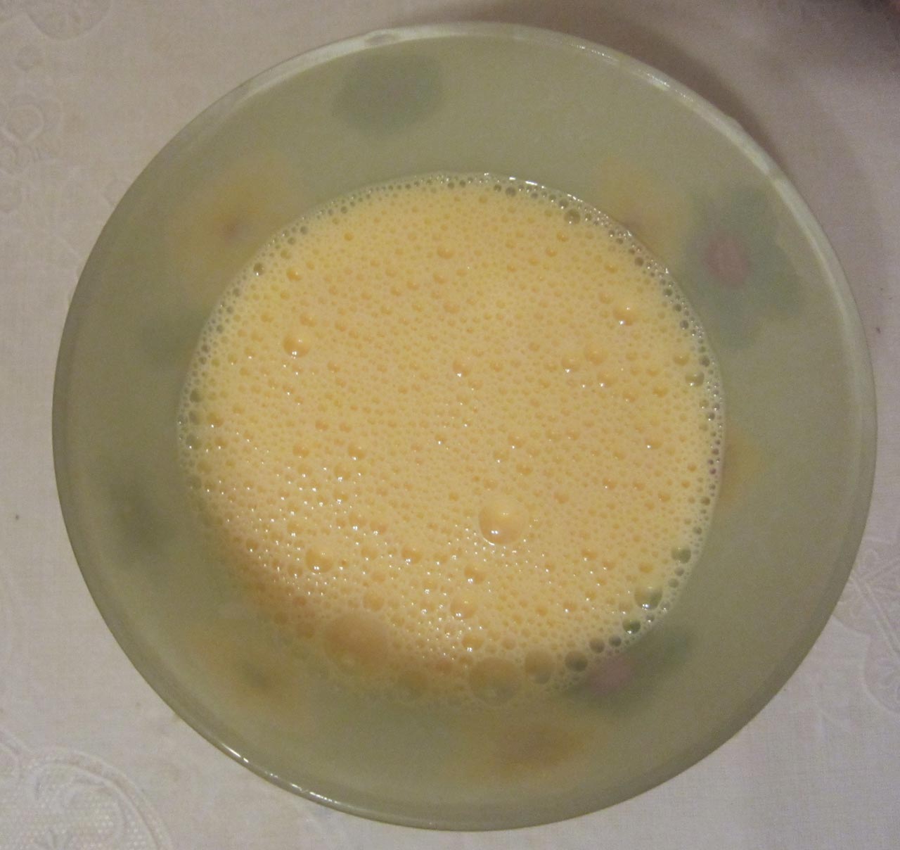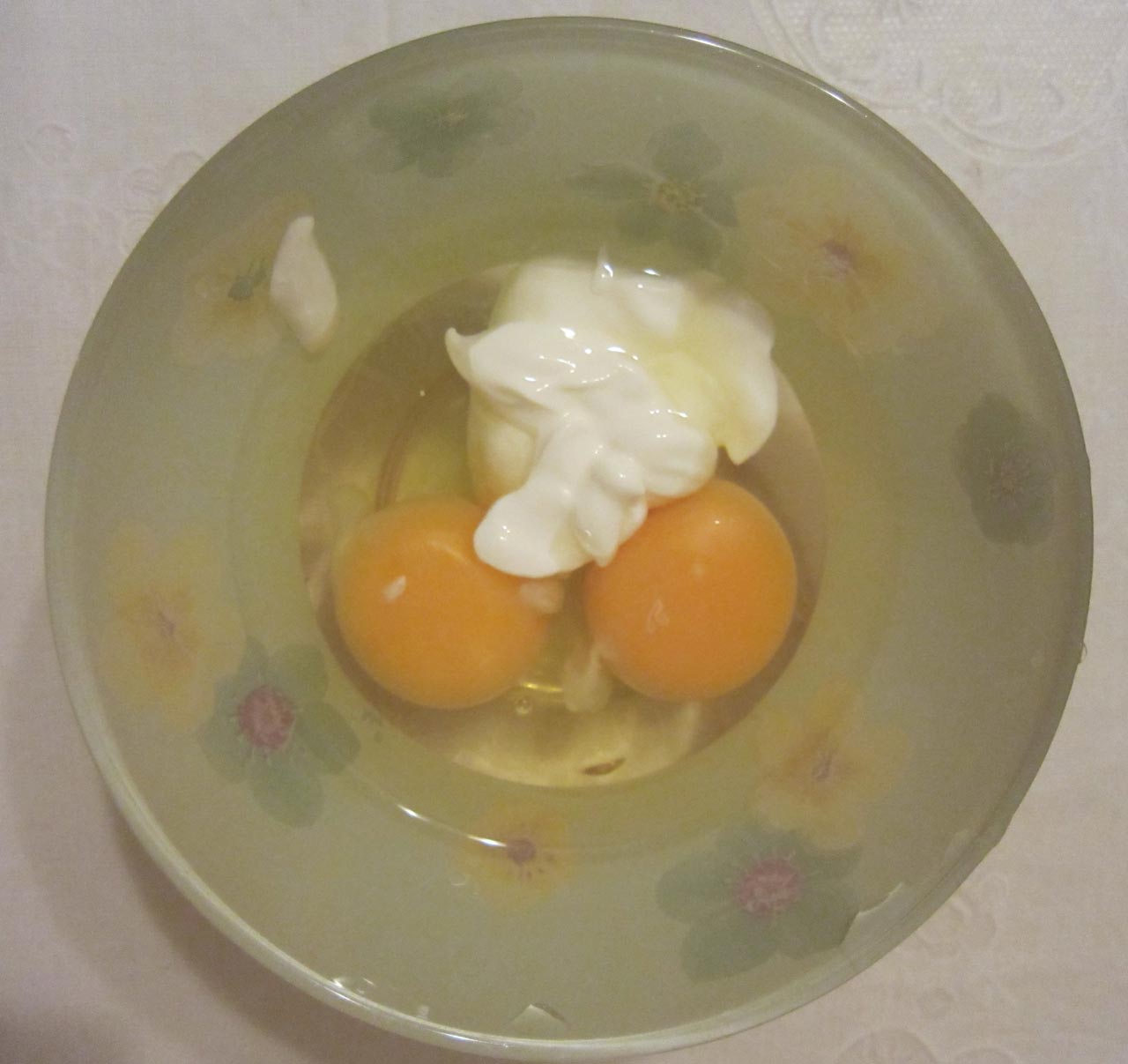 5. Разбиваем два яйца, добавляем к ним ложку сметаны и вилочкой взбиваем.